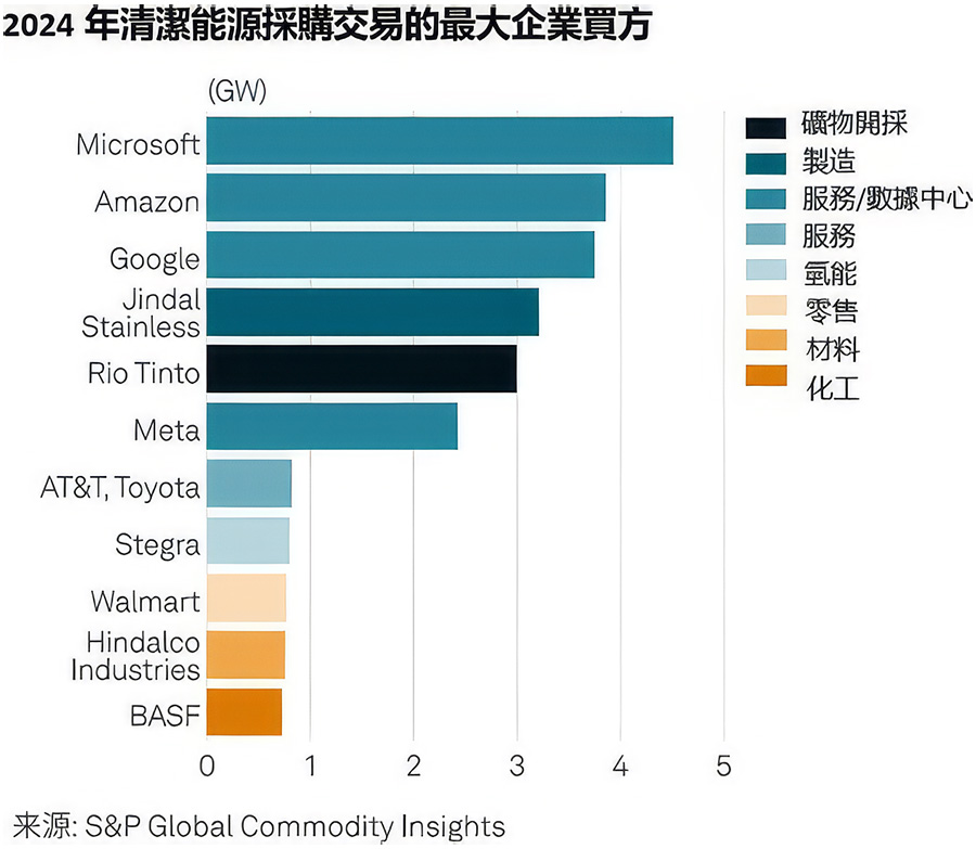 根據標普全球大宗商品的資料,資料中心在2024年的清潔能源採購中領先,主要通過直接購電協議達成超過17GW的交易。製造業以 9GW的清潔能源採購量位居第二,其後是服務業,採購量為 6GW。