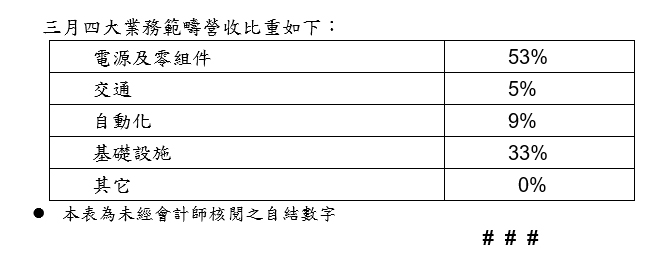 台達電子工業股份有限公司(9)日公佈115年3月份合併營業額為新台幣597.80億元,較114年同期合併營業額新台幣434.44億元成長37.6%,較上月份合併營業額新台幣498.97億元成長19.8%。115年1~3月份累積合併營業額為新台幣1,593.53億元,較114年同期累積合併營業額新台幣1,189.19億元成長34.0%。