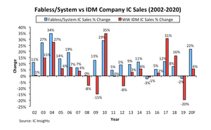 半導體市場研究機構IC Insights日前發布報告指出,無晶圓公司(Fabless)IC銷售佔有率將在2020年創下32.9%的新紀錄,單在2020年就猛增22%,而IDM IC銷售僅成了長6%。