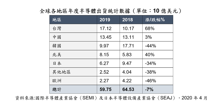 台灣穩坐去年半導體新設備的最大市場,銷售額增加68%,來到171.2億美元,讓韓國交出市場第一的寶座。中國保持第二大設備市場的地位,銷售額為134.5億美元,韓國則是下跌44%,以99.7億美元排行第三。相對日本、歐洲和世界其他地區新設備市場的萎縮態勢,北美設備銷售額2019年躍升了40%,達到81.5億美元,為該區連續第三年增長。