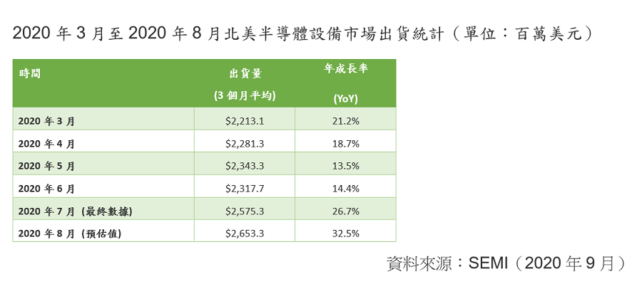 國際半導體產業協會(SEMI)公布最新出貨報告(Billing Report),2020年8月北美半導體設備製造商出貨金額為26.5億美元,較2020年7月最終數據的25.7億美元相比上升3.0%,相較於去年同期20.0億美元則上升了32.5%。