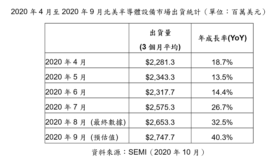 國際半導體產業協會(SEMI)今(23)日公布最新出貨報告(Billing Report),2020年9月北美半導體設備製造商出貨金額為27.5億美元,較2020年8月最終數據的26.5億美元相比上升3.6%,相較於去年同期19.6億美元則上升了40.3%。
