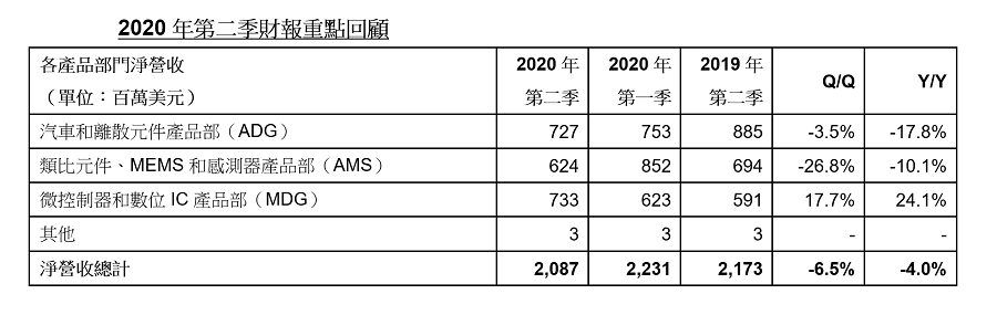 淨營收總計20.9億美元,較上年萎縮4.0%。與去年同期相比,影像、車用和MEMS微控制器的銷售下滑,但微控制器、數位晶片、類比元件和功率離散元件營收上揚消弭了部分降幅。代理商銷售營收較上年成長9.7%,而OEM銷售營收則衰退9.7%。第二季淨營收較上季減少6.5%,比公司預測的中位數低380個基點。依照產品部門統計,MDG的營收較上一季成長,但ADG和AMS之營收則不同程度的下滑。