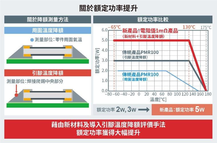 新產品透過採用溫度特性優異的新材料和引腳溫度降額,實現5W的額定功率。這在有保護膜的6432尺寸平面晶片型產品中屬於業界最高等級。與PMR100系列中的傳統2W產品相比,新產品的額定功率提高約2.5倍,與3W產品相比,額定功率提高約1.7倍,可以替換大型大功率產品,因此有助應用產品小型化。另外新產品還保證130℃的額定引腳溫度(0.5mΩ、1mΩ的產品)和-65℃~+175℃的工作溫度範圍,確保在高溫環境下也能穩定工作。此外,還具有+/-75ppm/℃的出色電阻溫度係數(TCR),可實現高精度且高可靠性的電流檢測。