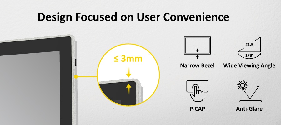 CV-200系列导入薄型铝合金一体压铸边框,边框宽度缩减至3 mm以内,可在不变更既有设备结构的前提下,提升有效显示面积。搭配Full HD解析度与178。超广视角,即便在产线多角度观看情境中,仍能维持清晰一致的显示效果。全系列采用投射式电容触控(P-Cap)技术,结合防眩光(AG)涂层,即使在高亮度室内照明环境下,也能兼顾画面可读性与精准流畅的触控操作体验,强化日常HMI操作效率。