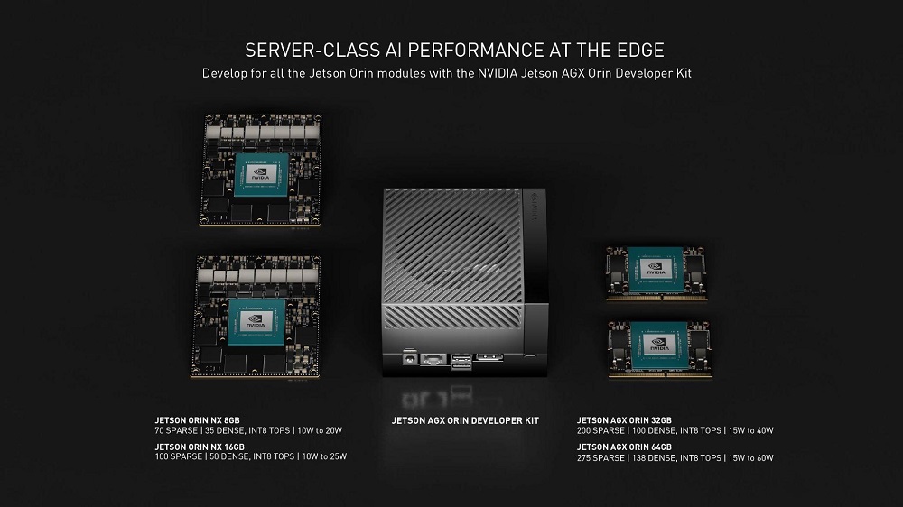 在 GTC 大會上宣布推出的四款 Jetson Orin 生產模組,提供客戶伺服器等級、全方位的 AI 效能。Jetson AGX Orin 32GB 模組現已供貨,64GB 版本將於 11 月上市。另外兩款 Orin NX 生產模組將於今年稍晚推出。
