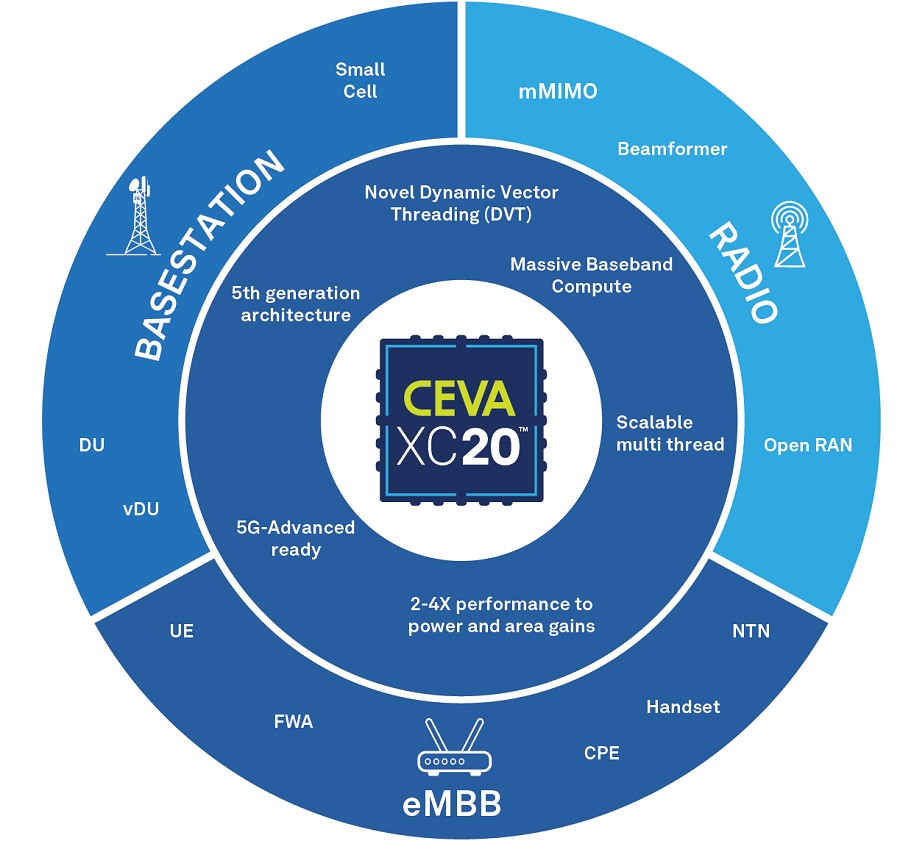 CEVA推出第五代CEVA-XC DSP架構,為迄今效率最高的CEVA-XC20架構。全新CEVA-XC20基於突破性的向量多執行緒大規模計算技術,旨在應對智慧手機、高端增強行動寬頻(eMBB)裝置,例如固定無線接入和工業終端,以及一系列蜂巢式基礎設施裝置等廣泛多樣用例中的下一代5G-Advanced工作負載。借助CEVA-XC20架構,SoC和ASIC設計人員可以利用先進的電源效率特性,設計出體積較小、功耗較低和更加節能的處理器產品,進而造福環境和社會。
