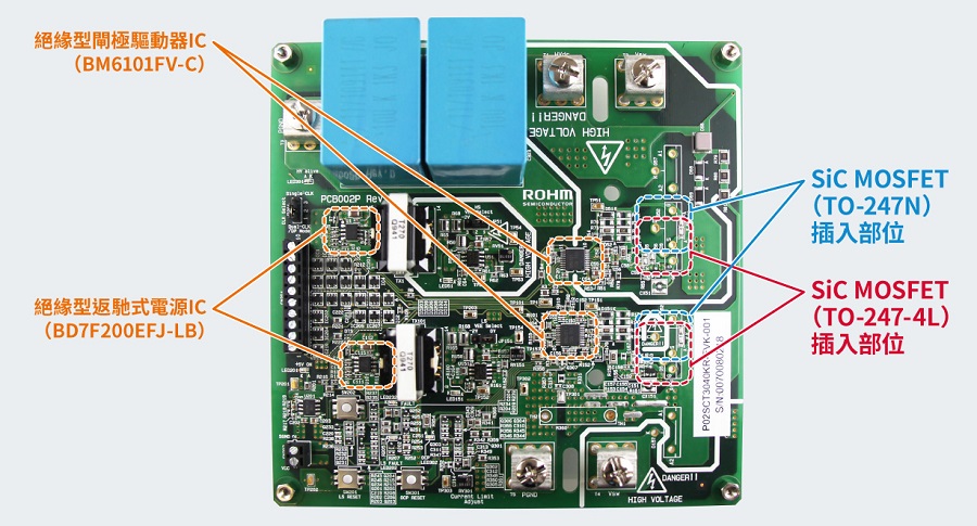 另外ROHM也已開始供應SiC MOSFET評估板P02SCT3040KR-EVK-001,其內建適合驅動SiC元件的ROHM閘極驅動器IC(BM6101FV-C)、各類電源IC及離散式產品,是一款容易進行元件評估的解決方案。