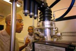 在晶片集積度越來越高,產品越做越小的狀況下,晶片的散熱冷卻系統就更重要了,甚至是未來發展電腦或其它電子裝置的關鍵所在。日前普渡大學的研究人員就發展了一種新的熱導介面,即在晶片上建構奈米碳管圓柱夾層,它比傳統的金屬片或油膏之類方式的效能要好很多,圖中研究人員正從分子擴散為dendrimers的材料中形成矽晶面上的基質,然後再用金屬蒸氣催化顆粒沉殿形成奈米碳管森林,住在森林裡的晶片當然涼快了。(圖/David Umberger)