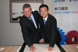 企业数据库及电子商务应用日趋频繁,采用易于使用、快速导入、高效能、低成本优异效能的数据库管理解决方案与应用服务器,将成为企业致胜关键。自2006年起即代理Quest产品线的倍力信息,在各产业的实际管理操作成绩表现优异,因此获得Quest台湾区总代理权。图为倍力信息总经理许金隆(右)与Quest亚太区副总Richard Moseley共同进行签约仪式,并为台湾企业与信息投资带来新期望。(摄影\岫晨)